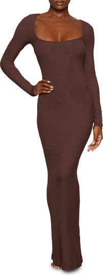 A classic everyday style, this square-neck maxi dress in ribbed stretch modal from Kim Kardashian's SKIMS hugs your body with relaxed comfort.