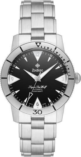 A glossy black dial modernizes a stainless steel watch outfitted with powerful water resistance and luminescent details.