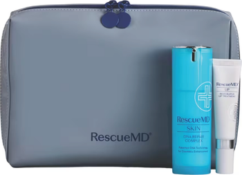 - RescueMD Beauty Bag: A sleek, glossy bag designed with double zippers for easy access and secure storage. This elevated essential keeps your skincare favorites organized at home and on the go.