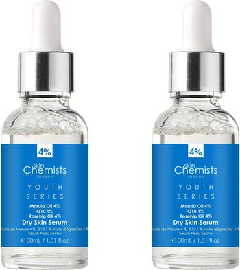 skinChemists Youth Series Dry Skin Serum Marula Oil %, Q %, Rosehip Oil % ml For Dry, Dehydrated & Sensitive Skin – Your Ultimate Hydration Solution Struggling with dry, flaky skin? Our Nourishing Dry Skin Serum is specially formulated to tackle dryness and enhance your skin's natural radiance. Infused with Marula Oil, Q, and Rosehip Oil, this powerful serum deeply hydrates, detoxifies, and restores your skin's barrier for a soft, rejuvenated complexion. What It Does: Deeply hydrates with Marula Oil for lasting moisture Restores skin barrier with Q for enhanced protection Soothes and revitalises with Rosehip Oil, ideal for Rosacea and Eczema Lightweight and fast-absorbing, perfect for day and night use The Solution: Dry, tight skin? Experience intense hydration and comfort. Dealing with redness or irritation? Rosehip Oil calms and refines. Want a youthful glow? Rejuvenate your skin for a radiant appearance. How to Use: Apply - drops onto clean, dry skin morning and evening. Follow with your favourite moisturiser for optimal results. Why You'll Love It: Suitable for all skin types, including sensitive Vegan, cruelty-free & free from parabens, sulfates & artificial fragrances Experience the difference today! Apply our Dry Skin Serum to clean, dry skin in the morning and evening for hydrated, rejuvenated skin, perfect for those dealing with Rosacea and Eczema.