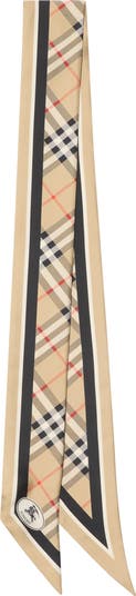 A skinny scarf made in Italy from silk twill, printed with the Burberry Check. The design is framed with contrasting stripes and our Knight stamp, an archival motif first seen on Burberry bags in the 1980s.||Tapered tips|Printed Equestrian Knight Design at tip