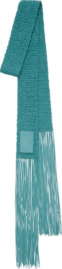 A skinny scarf intricately hand-crocheted from leather in a fresh take on knitwear. Debuted on the Burberry Summer 2025 runway, the style is finished with a tonal Equestrian Knight Design label and exaggerated fringing.||Rectangular|Fringing at both ends|Leather Equestrian Knight Design label