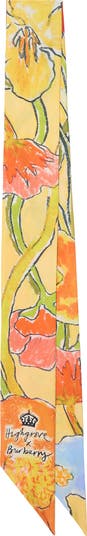 A silk twill skinny scarf, created in partnership with Highgrove Gardens, which surround the private residence of Their Majesties King Charles III and Queen Camilla. Featuring hand-drawn artwork by the British artist Helen Bullock, the print depicts the tangled sway of poppies, cosmos and sweet peas found in the Kitchen Garden at Highgrove.||Tapered tips|Printed Highgrove x Burberry logo|The Highgrove mark is used under licence from A G Carrick Limited