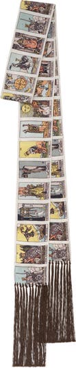 A skinny scarf made in Italy from silk poplin with exaggerated knotted fringing. Reimagining Edwardian tarot cards, the design is printed with esoteric designs inspired by British artist Pamela Colman Smith.