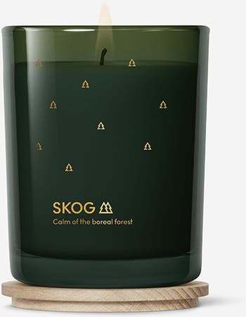 Pine needles and fir cones, birch sap and woodland lily of the valley. Special gold edition scented candle. A perfume and Swedish rapeseed wax blend in painted glass with a pure cotton wick and engraved beechwood lid. Packaging card from managed Nordic forests with water based colour dyes. 200g. Up to 50 hours. SKOG - Swedish/Norwegian for ‘forest’ Boreal forests cover over half the Scandinavian lands, stretching from the southernmost county of Sweden to the Arctic Circle.