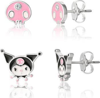- Official license Hello Kitty jewelry collection showcases 2 pairs of stud earrings featuring cute and punky Kuromi stud earrings and pink skull stud earrings with a white crystal accent for a touch of sparkle