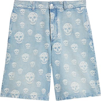 Long denim jacquard shorts crafted in Italy showcase McQueen's iconic skull motif and are finished with a heavy bleached wash for lived-in appeal.