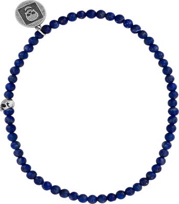 A weathered sterling silver skull bead and logo charm punctuate a stackable stretch bracelet strung with polished semiprecious lapis lazuli stones.