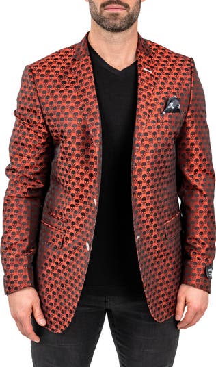 Bring a bit of edge into your formal attire with this sport coat that's punctuated with skulls and framed with notched lapels.