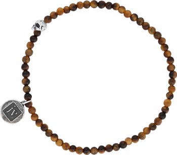 A weathered sterling silver skull bead and logo charm punctuate this stackable stretch bracelet strung with polished semiprecious tiger's-eye stones.