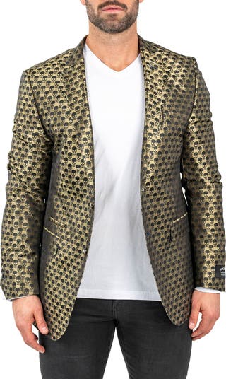 Turn heads in this lustrous, skull-patterned blazer showcasing a built-in pocket square and a trimmer fit around the arms and chest.