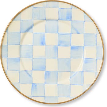 Serve your favorite salads and desserts on this charming hand-painted plate featuring a signature Sky Check pattern and gilt detail at the edges.