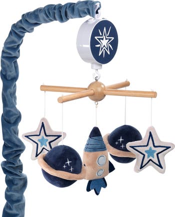 - Custom designed crib mobile features embroidered stars, planets, and a rocket ship