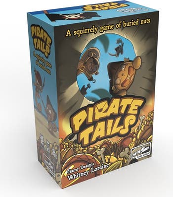 PIRATE TAILS - Skybound Tabletop - A squirrely game of buried nuts - Chitter me timbers! Pirate Tails is an elegant and addictive set collection game in which you are a scurvy squirrel struggling to gather the best collection of nuts. To do this you'll need to bury nuts around the island and return for them later in the round. But be careful! IF you hide too many valuable cards in one spot, they may not be there when you return! Set Collection, animal themed, card card. 2 to 5 players. Games last 15-30 minutes allowing for multiple sessions in one sitting. Suitable for ages 8 and up. Game Design: Whitney Loraine. WHATS IN THE BOX: 88 Nut Cards, 10 Candy Cards, 5 Hiding Spot Cards.