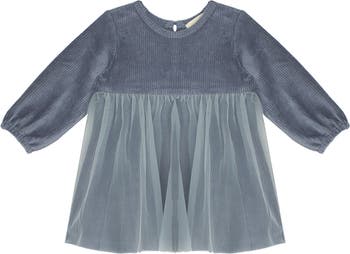 Elevate her wardrobe with the Skylar Dress, beautifully designed in a subtle shade of slate blue. This dress features a unique combination of soft courduroy fabric on the bodice and a lightweight tulle skirt for a touch of whimsy.