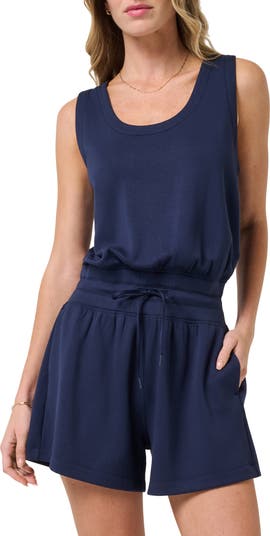 A dainty tie defines the waist of this sporty sleeveless romper cut from soft stretch-kissed fabric.