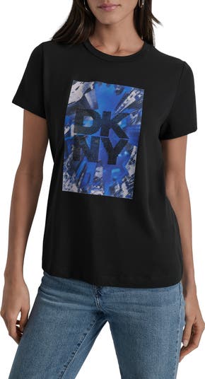 Two great icons complement each other on this fab T-shirt boasting a bold graphic of NYC skyscrapers and a bedazzled brand logo.