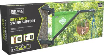 TRELINES: SKYSTAND SWING SUPPORT - This versatile tree mount means any strong tree can now be the home for your favorite swing. NO BRANCH? NO PROBLEM: Say goodbye to searching for a strong branch for your swing — now you can swing freely on your favorite tree. VERSATILE SWING SUPPORT: The SkyStand is an innovative swing support designed to create the ideal branch to hang a swing. ENGINEERED TO THE MAX: Designed with strength in mind, the solid steel frame is powder-coated for outdoor durability, it mounts securely and can support up to 500lbs (Tree diameter min 12” (30.5 cm)). 360 DEGREE SWINGING: The unique grip-lock plates add strength and the 360-degree swiveling attachment allows swinging in every direction. Add the joy of a swing to your backyard! OVERVIEW: Powder-coated stainless-steel frame. Secure grip-lock plates. Rugged ratchet straps. 30 minute simple setup for 2 people. Tools included. Fits most trees - Diameter: 12 to 20" (30 to 50 cm), Circumference: 37 to 63" (94 to 160 cm), Minimum Straight Trunk: 24" (61 cm), Minimum Height: 8' (2.4 M). Supports 500lb (226 kg). Life is better outside! INCLUDES: 1 Tree Mount Frame, 2 Ratchet Straps, Secure Grip-Lock Plates, and 360 Swivel Attachment. Life is better outside!