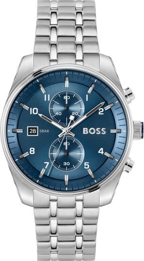 Dual subdials and a streamlined silhouette enrich a sophisticated chronograph watch housed on a polished bracelet.