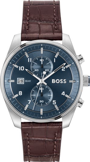 Dual subdials and a streamlined silhouette enrich a sophisticated chronograph watch housed on a croc-embossed leather strap.