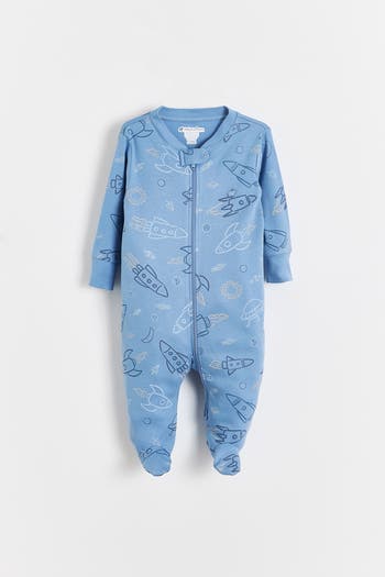 Printed pima cotton footie with long sleeves and a full-front closure from neck to toe. Made of soft pima cotton. The print also features glow-in-the-dark details, which glow when exposed to natural light.