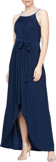 Twinkling beads adorn the neckline of an elegant evening dress accented with gentle gathers and a graceful high-low hem.