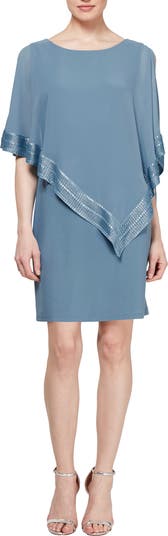 This simple sheath dress is styled for glamour with a sheer, asymmetrical capelet accented by glistening metallic trim and cold-shoulder sleeves.