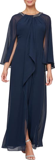 Flowy chiffon cape sleeves romance this glamorous gown designed with a beaded embellished neckline and a cascading front ruffle.