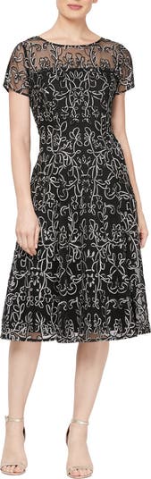 Metallic soutache details this midi dress with a chic see-through yoke for the perfect new go-to.