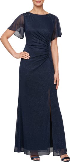 Fluttery sheer sleeves and sparkly shoulder embellishments decorate this glittery, event-ready gown finished with a leg-baring slit.