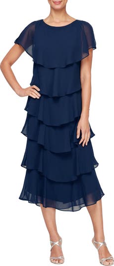 Rows of ruffles add enchantment to a chiffon dress that's ready for the party circuit. Beaded accents at the fluttering slit sleeves instantly accessorize the romantic look.