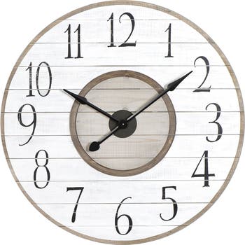 Add a touch of warmth and charm to the home with this round wood slat wall clock. This rustic clock features a two-tone slatted wood construction, giving it a unique and textured look. The clock face has black numerals and hands contrasting with the white and brown backgrounds. The clock has a playfully designed movement that adds some flair and personality. The clock requires one AA battery (not included) to operate. It has a quartz movement that ensures accurate timekeeping and a gentle ticking sound. The clock measures 36 inches in length, 2.25 inches in width, and 36 inches in height. This wall clock is a perfect gift for the self or someone special who loves rustic and cozy items. Whether it is a touch of sophistication to the home or impress the guests with exquisite taste, this clock is the perfect choice.