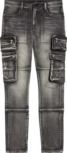 Cargo pockets and paneled knees add a utilitarian edge to faded skinny jeans finished with a triple cross design at the back pocket.
