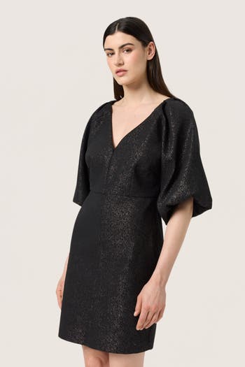 The SLCahlina mini dress is a cool and sparkly cocktail dress, perfect for the parties of the season. It has a deep V-neck and a slim fit, and it is made in a metallic fabric. The sleeves are half-length raglan puff sleeves with lots of volume, and the dress is cut at the mid-thigh.
