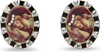 - Cameo earrings printed with original artwork framed by jet and clear baguette crystals and adorned with pearls