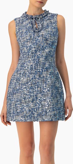 This short A-line boucle with sequins dress features a round neckline and a keyhole detail, offering a stylish and comfortable fit.