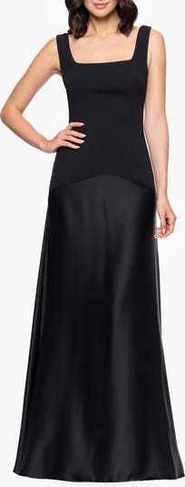 A stretchy scuba bodice and flowy satin skirt make this A-line dress a stunning option for your next occasion.