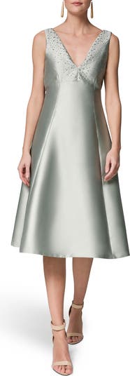 Shimmering crystals highlight the classic V-neck of this occasion-ready A-line dress fashioned from smooth satin.