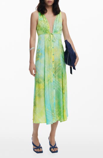 Watercolor prints brighten this dreamy Empire-waist midi dress framed by an alluring plunge neck and flowy A-line skirt.