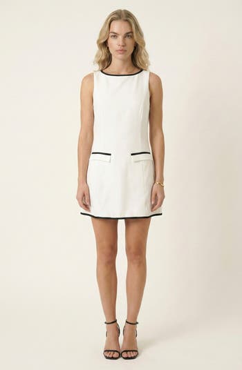 This sleeveless A-line mini dress combines timeless elegance with modern charm. Featuring a clean boat neckline and structured silhouette, it flatters the figure while offering effortless sophistication. The contrast trim along the edges and faux pocket details add a polished, tailored touch, enhancing its versatile appeal. Crafted from a smooth, structured fabric, this dress is perfect for work, brunch, or formal events. Pair it with heels or flats for a chic, put-together look that transitions seamlessly from day to night.