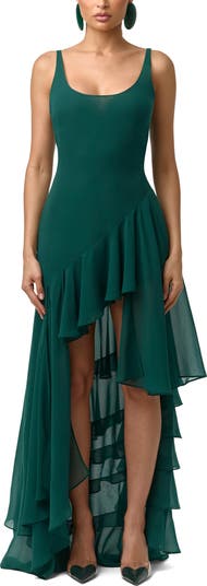 Frothy chiffon ruffles flutter with every step on this party-ready dress fashioned with an alluring open back and dramatic high-low hem.