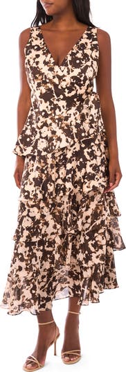 A bold floral print and fluttery ruffles bring drama to this swishy wrap dress featuring asymmetric tiers.