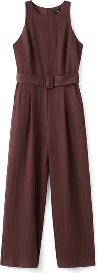 A wide, tonal belt defines the waistline of a sleeveless jumpsuit made with convenient on-seam pockets and a crinkled texture that gives your look a lived-in vibe.