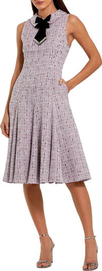 Chic and preppy, this sleeveless lilac tweed dress features a flared skirt and statement collar with velvet bow—perfect for day-to-dinner looks.