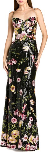 Elegant and glamorous, this sequin gown features a sweetheart neckline, delicate spaghetti straps, and floral appliqué accents for standout special-occasion style.