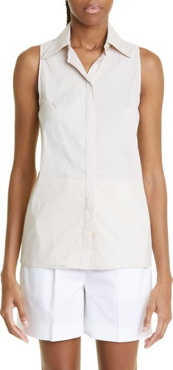A slender, sleeveless silhouette updates a beloved point-collar classic fronted with a hidden-button placket.
