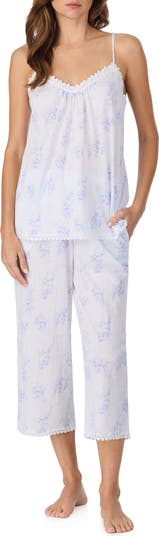 Soft cotton jersey keeps you cool and comfy in these charming PJs that pair a lace-accented sleeveless top and capri-length bottoms.