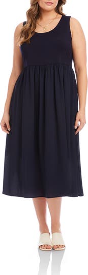 A close-fitting knit bodice shapes the silhouette of this sleeveless midi made with a light and drapey skirt for contrast.
