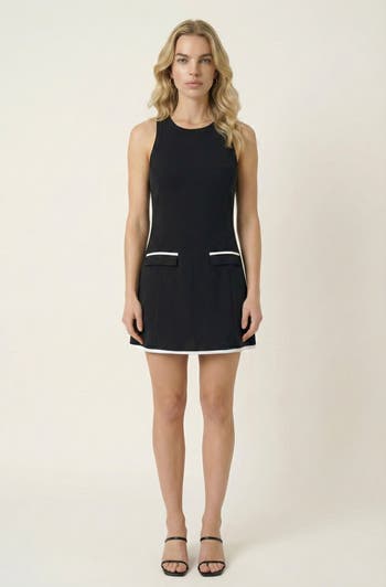 This tailored mini dress features a structured sleeveless silhouette with sleek contrast piping along the neckline, hem, and faux pocket flaps for a polished finish. The fitted bodice and subtle A-line skirt create a flattering shape, while the decorative flaps add a playful yet refined touch. Perfect for daytime events or elevated casual outings, this dress blends modern minimalism with timeless charm.