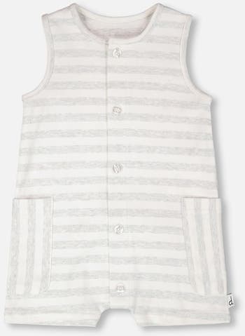 Playful and sweet, our cotton striped romper stripes is perfect for summer days. This baby one-piece features a sleeveless cut, a front button placket, and practical patch pockets on each side for a charming touch. Made from soft jersey cotton, it offers comfort and breathability for everyday adventures.